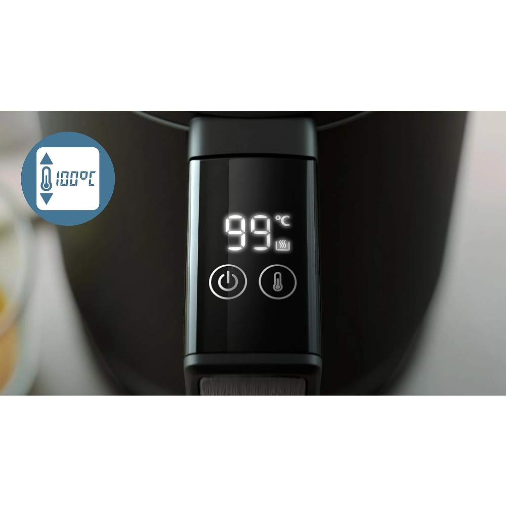 Acero inoxidable para uso alimentario, Apertura de la tapa con resorte, Base de giro de 360°, Control de temperatura: 6 ajustes, de 40 a 100 °C, Desconexión automática, Doble pared, Función de conservación calor, Indicador de tazas, Más de 10 alimentos y bebidas, Pantalla LED, Protección contra hervido en seco, Protección contra hervido sin agua, Recogecable, Segura al tacto, Tapa de gran abertura |